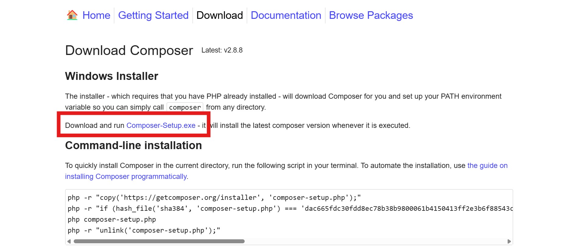 Jika sudah komputer telah memenuhi persyaratan, proses selanjutnya adalah mendownload Composer melalui website resminya di https://getcomposer.org/.