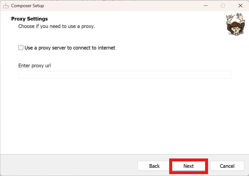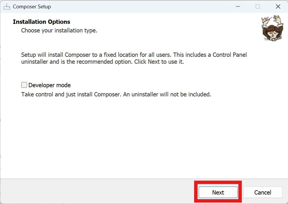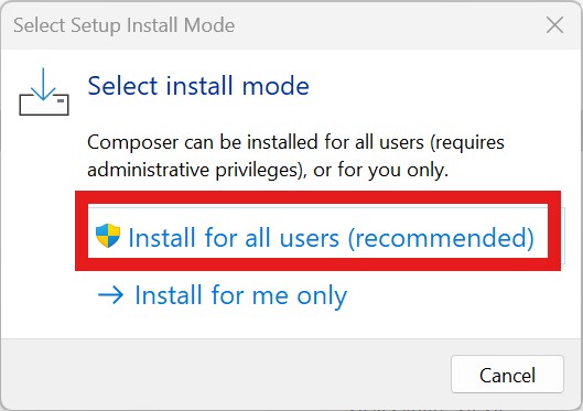 Langkah Pertama Jalankan file installer yang telah didownload dengan cara klik dua kali pada file Composer-Setup.exe. Jika muncul tampilan seperti dibawah ini, pilih Install for all users (recomended).