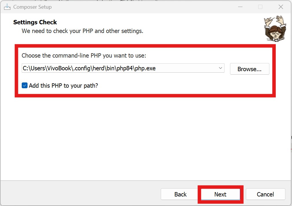 Selanjutnya installer akan mencari path PHP secara otomatis. Jika PHP tidak terdeteksi, kamu bisa arahkan ke filephp.exe secara manual dari folder PHP yang tersedia. lalu klik Next.