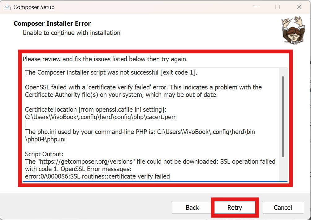 Jika terdapat error seperti dibawah ini pada saat proses installasi berjalan, silahkan matikan terlebih dahulu antivirus yang ada pada komputer anda, kemudian klik Retry untuk kembali menjalankan proses installasi.